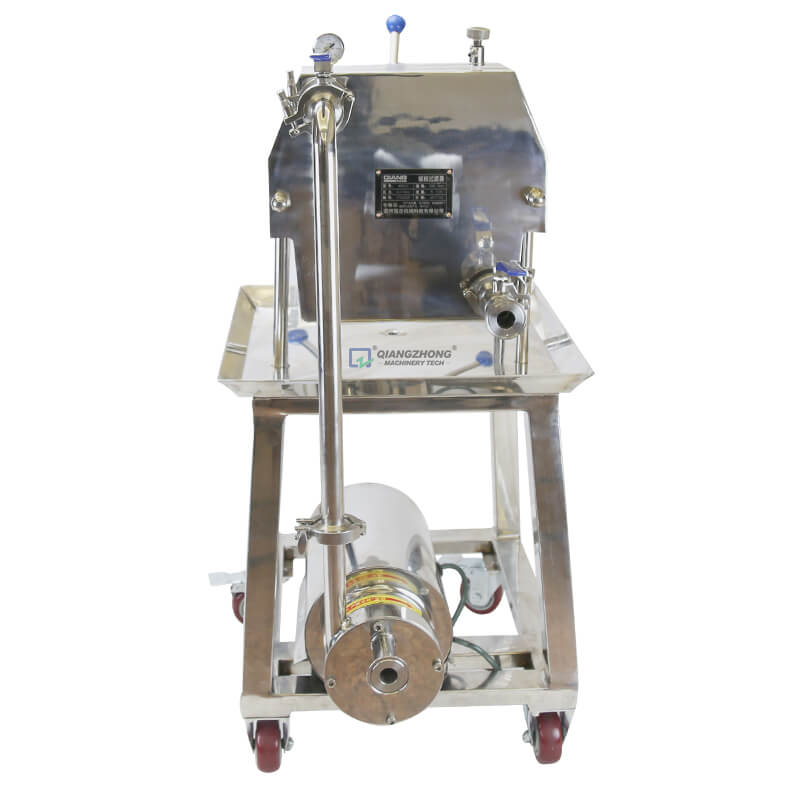 该滤器具有滤液损耗少,流通量大,操作简单,拆装方便,易清洗等优点。滤板采用特殊结构的平面螺纹网状形,光滑平整,使滤材(滤布、滤纸、滤膜)不易破损,能有效地延长各种滤材的使用寿命,从而降低生产成本。本滤器配备不锈钢输液泵,其配用电机功率小,耗电省。机架下装有胶轮,移动灵活、轻便。